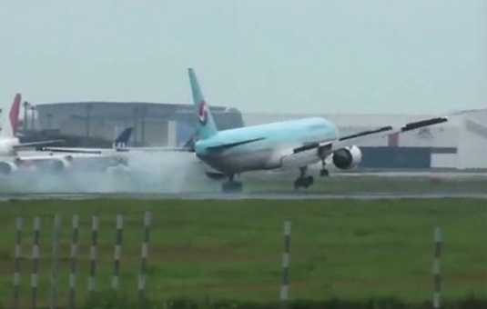 지난 10일 reckenb이란 아이디 사용자가 올린 이 동영상에는 대한항공 777 여객기가 활주로에 착륙할 때, 비행기가 오른쪽으로 기운 채 한쪽 바퀴만 바닥에 닿았다.