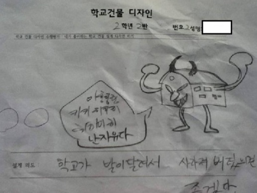 이는 초등학교 2학년 학생이 '학교 건물 디자인하기'라는 숙제에 대한 그림으로, 팔과 다리가 달려있고 뿔이 난 학교가 사악한 웃음을 지으며 "난 자유다"라고 말하는 모습을 그렸다.