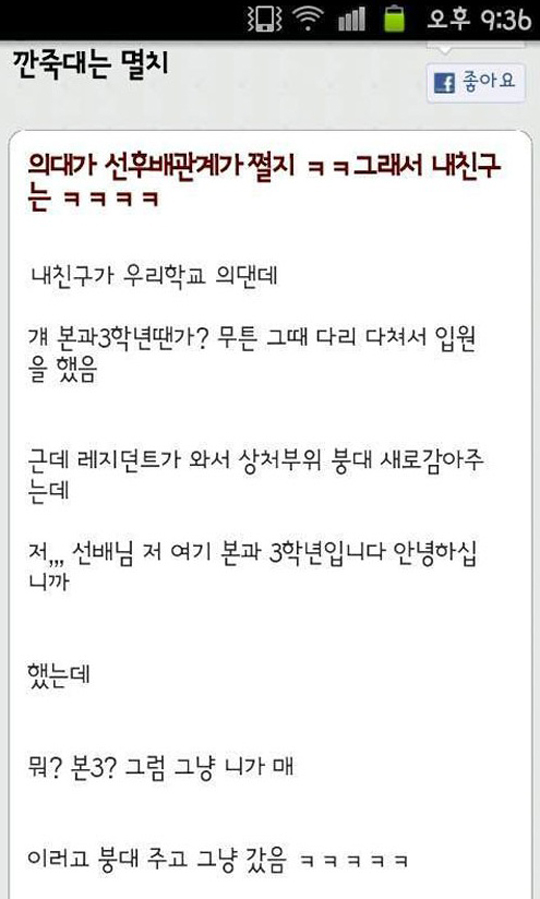 사진에는 한 의대생이 겪은 에피소드가 담겨 있었다. 한 의대생이 다리를 다쳐 간 병원에서 만난 레지던트는 이 의대생의 선배였다는 것. 후배라며 인사하자, "우리 학교 본과 3학년이라고? 그럼 그냥 네가 매라"라며 붕대를 던지고 갔다는 이야기다.