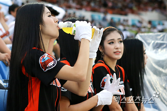 [엑스포츠뉴스=목동, 권혁재 기자] 17일 오후 잠실구장에서 열린 '2012 팔도 프로야구' 넥센 히어로즈와 롯데 자이언츠의 경기에서 롯데 여신으로 인기몰이 하고 있는 롯데 치어리더 박기량이 휴식을 취하며 음료를 마시고 있다.