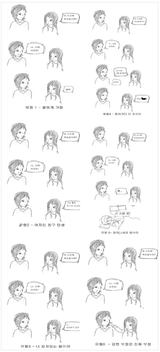 고백 거절 유형 그림을 접한 네티즌들은 "강한 부정은 진짜 부정, 대박", "어쨌든 다 거절", "쿨한 거절이 낫다 차라리", "유형이 달라도 상처는 마찬가지"등 다양한 반응을 보였다.
