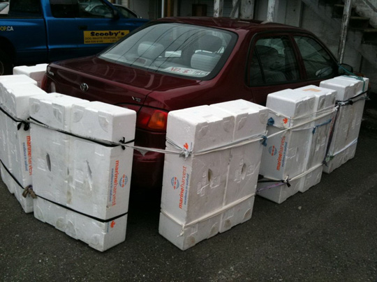 공개된 사진에는 한 자동차가 주차되어 있고, 자동차 주위를 대형 스티로폼 박스 여러 개가 둘러싸고 있는 모습이다.