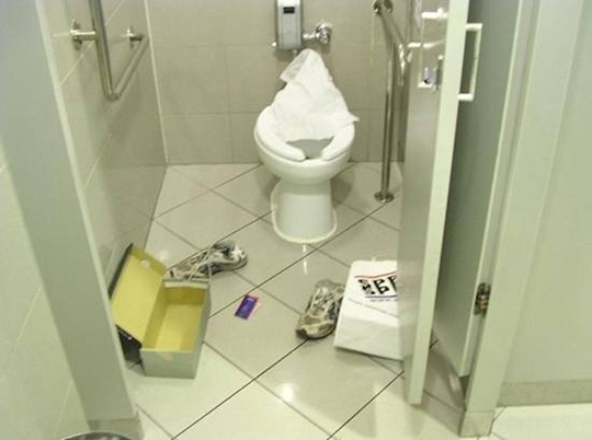 공개된 '신발 산 자의 기쁨' 사진 속에는 화장실에 헌 신발과 새로 산 신발 박스가 어지럽게 널브러져 있는 모습이 담겨 있다.