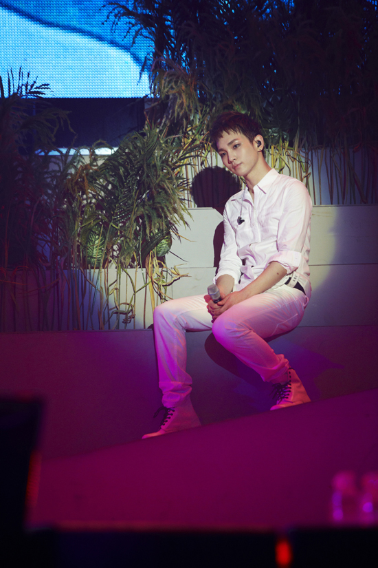 멤버 키가 공연 도중 청초한 모습으로 객석을 바라보고 있다.