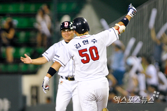 [엑스포츠뉴스=잠실, 권혁재 기자] 24일 오후 서울 잠실구장에서 열린 '2012 팔도 프로야구' 두산 베어스와 LG 트윈스의 경기에서 두산이 6-5로 앞선 5회말 2아웃 1, 3루 두산 김현수가 우중간 쓰리런포를 날리고 그라운드를 달리며 환호하고 있다.
