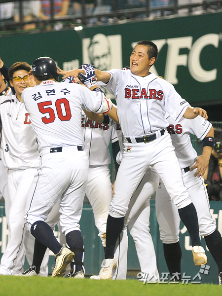 [엑스포츠뉴스=잠실, 권혁재 기자] 24일 오후 서울 잠실구장에서 열린 '2012 팔도 프로야구' 두산 베어스와 LG 트윈스의 경기에서 두산이 6-5로 앞선 5회말 2아웃 1, 3루 두산 김현수가 우중간 쓰리런포를 날리고 들어와 동료들의 축하를 받고 있다.