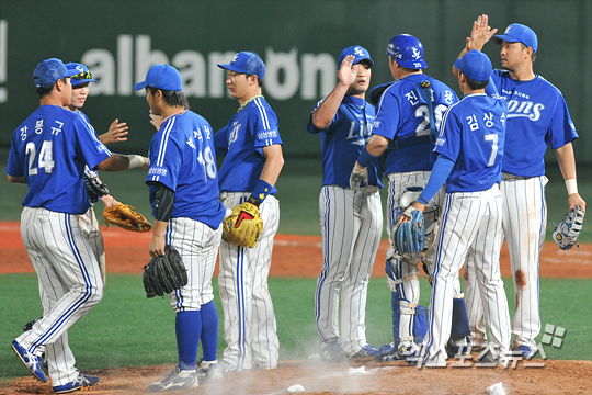 승리를 거둔 삼성 선수들이 마운드에 모여 하이파이브를 나누고 있다.