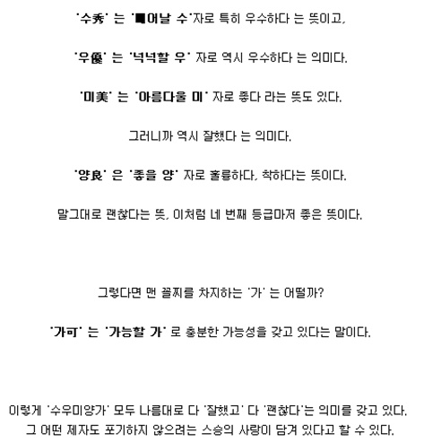 한편, '수우미양가 담긴 뜻'을 접한 네티즌들은 "나쁜 뜻이 하나도 없네", "모두 깊은 의미를 포함하고 있다니", "단순히 성적을 판단하는 기준이 아니네", "모두 잘한 거에요" 등의 반응을 보였다.