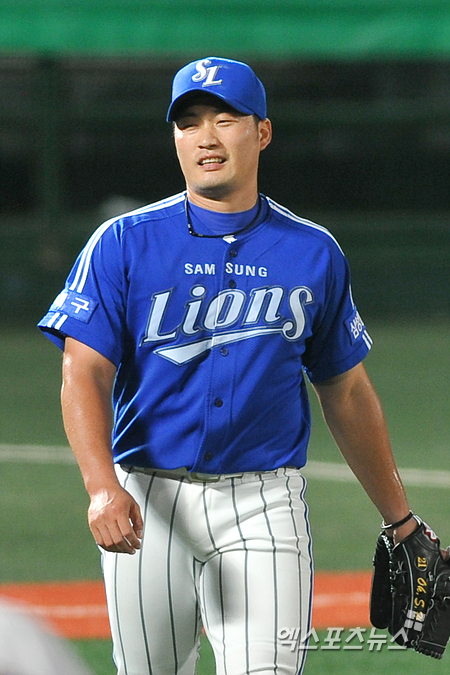 1점차 승리를 지킨 삼성 오승환이 멋적은 웃음을 짓고 있다.