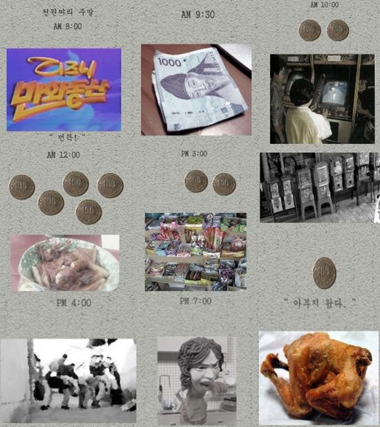 '천원짜리 주말'을 보내는 방법은 주말 아침 8시에 일어나 '디즈니 만화동산'을 시청한 후 집에서 밥을 먹고 부모님이 주신 용돈 천원으로 오락실에서 오락을 한 뒤 점심시간이 되면 배고픔을 달래기 위해 떡볶이를 사먹고 친구들과 집에서 게임기로 시간을 보내는 일정이다.