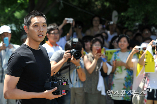 [엑스포츠뉴스=춘천, 권혁재 기자] 7일 오후 강원도 춘천시 102보충대를 통해 현역으로 입대하는 배우 지현우가 취재진과 팬들 앞에 입장하여 입대 전 인터뷰를 하고 있다.