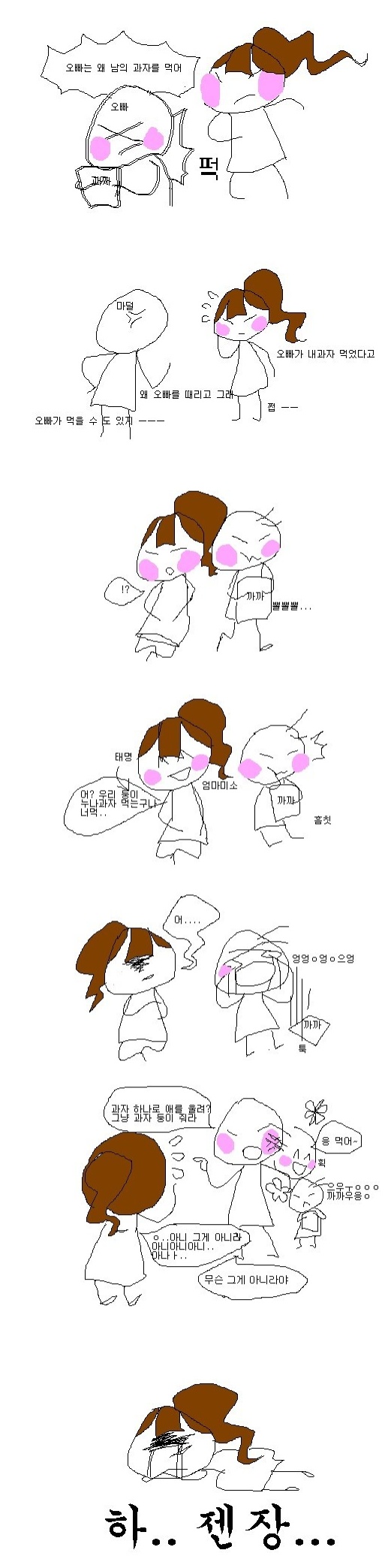 그림 속 둘째는 자신의 과자를 뺏어 먹고 있는 오빠에게 대들지만, 이를 본 엄마는 오히려 오빠 편을 든다.