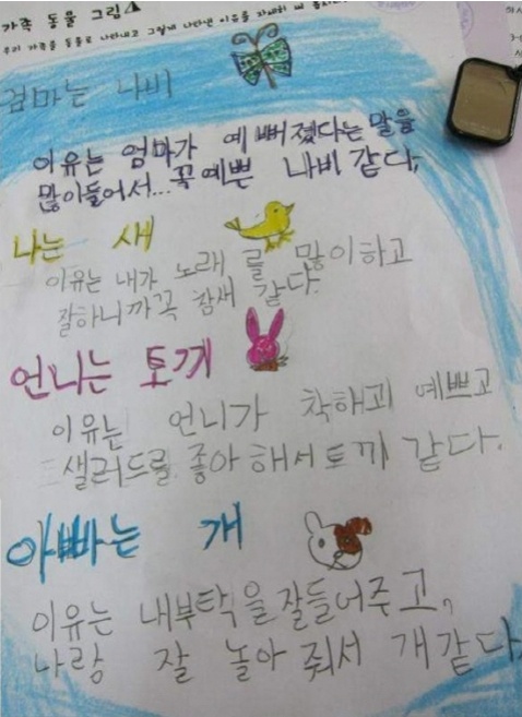 공개된 '어느 초등학생 그림일기' 사진은 한 초등학생이 나, 언니, 엄마, 아빠를 동물에 비유한 그림이다.