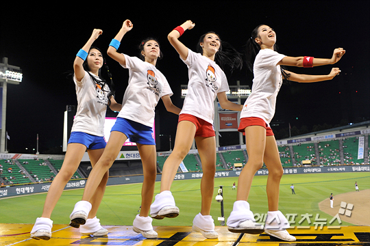 [엑스포츠뉴스=잠실, 권혁재 기자] 7일 오후 서울 잠실구장에서 열린 '2012 팔도 프로야구' LG 트윈스와 롯데 자이언츠이 경기에서 롯데 치어리더들이 신나는 응원을 펼치고 있다.