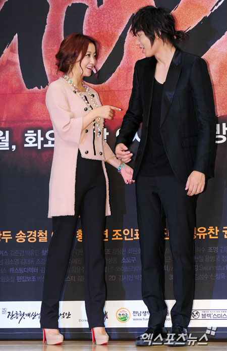 [엑스포츠뉴스 = 권태완 기자] 9일 오후 서울 목동 SBS사옥에서 열린 SBS 특별기획드라마 '신의' 제작발표회에 김희선(왼쪽)과 이민호가 함께 포즈를 취했다.