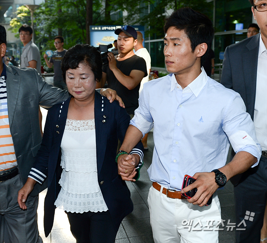 양학선이 어머니의 손을 꼭 잡고 선수단 차량으로 이동하고 있다.