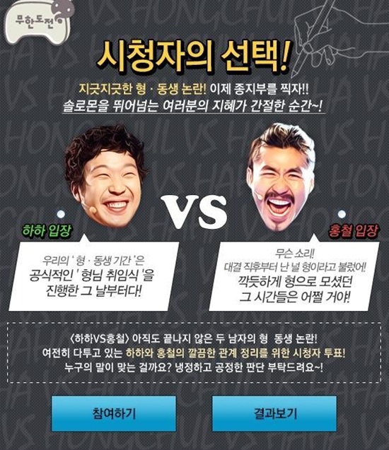 이에 제작진은 '무한도전' 공식 홈페이지를 통해 하하 홍철 형 동생 논란 종지부를 찍기 위한 시청자 투표를 진행하고 있다.