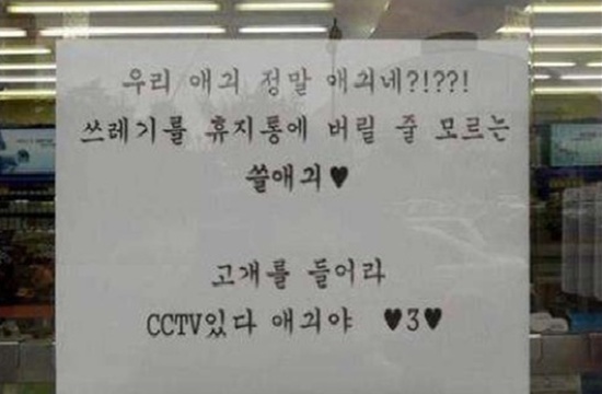 해당 사진은 편의점에 붙어있는 안내문을 찍은 것으로, 안내문에는 '우리 애긔 정말 애긔네? 쓰레기를 휴지통에 버릴 줄 모르는 쓸애긔. 고개를 들어라. CCTV있다. 애긔야'라고 적혀 있어 보는 이들에게 웃음을 선사했다.