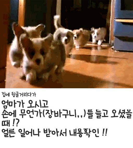 공개된 게시물 속 영상은 방 안에서 강아지들이 동시에 뛰어나오는 모습을 담고 있는 모습이다. 장을 보고 오신 엄마가 집에 도착했을 때 먹을 것을 찾아 달려가는 우리의 모습을 떠올리게 해 웃음을 자아내고 있다.