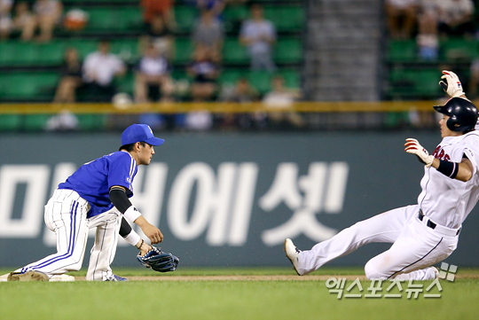 [엑스포츠뉴스=잠실, 권혁재 기자] 17일 오후 잠실구장에서 열린 '2012 팔도 프로야구' 두산 베어스와 삼성 라이온즈의 경기 삼성이 2-0으로 앞선 7회 삼성 유격스 김상수가 2루도루를 시도하고 두산 이원석을 태그아웃 시키고 있다.