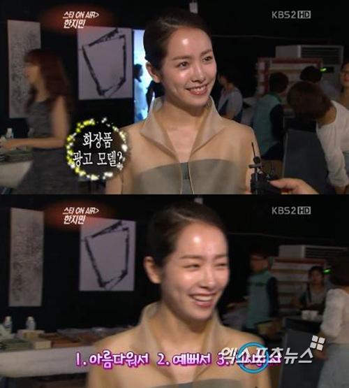 한지민은 잠시 고민하다 "섹시해서?"라고 대답하면서 쑥스러웠는지 웃음을 터뜨렸다.