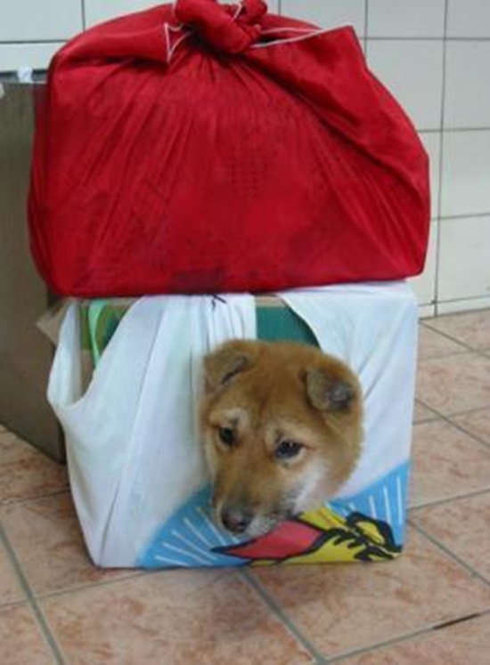 해당 사진은 바구니 속 상자에 개를 넣고 사진을 찍은 것으로 사진 속 개 한 마리는 보자기로 묶인 상자 속에서 머리만 빠끔히 내밀고 있는 모습이다.