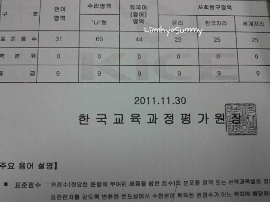 사진 속에는 전 과목 모두 9등급을 받아 백분위가 0으로 표기된 성적표가 담겨 있다.