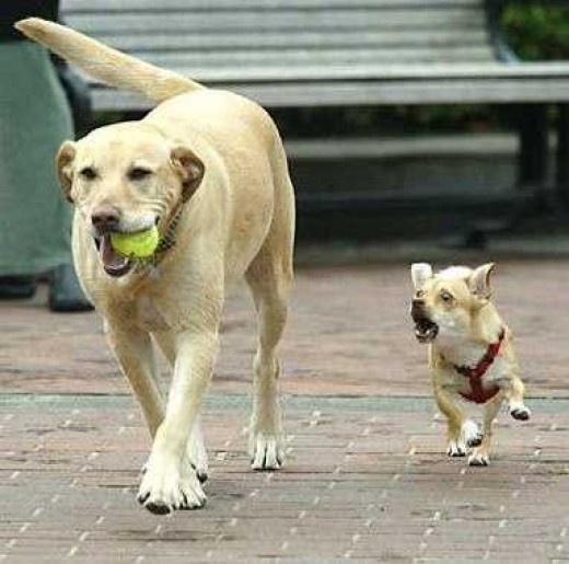 사진 속에는 입에 공을 물고 가는 큰 개와 그 뒤를 열심히 쫓아가는 작은 개의 모습이 담겨 있다.