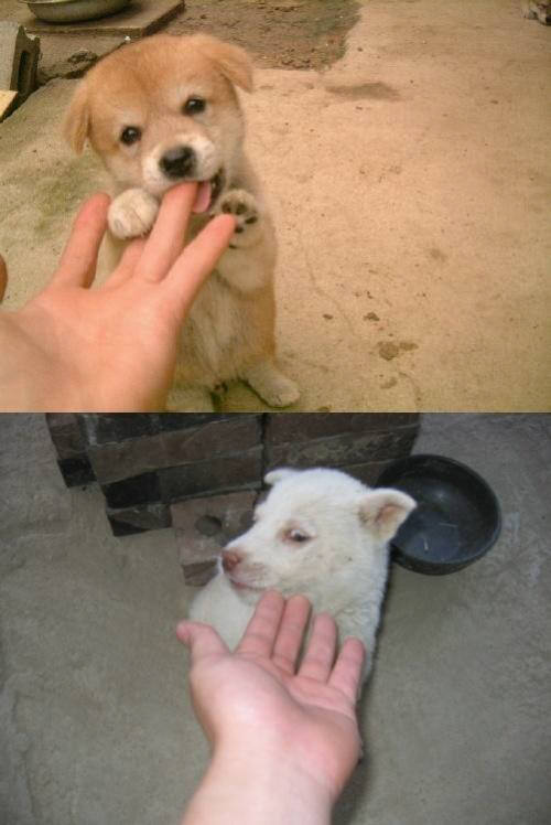 반면 다른 사진 속에는 남자가 손을 내밀자 강아지는 고개를 돌리고 눈을 가늘게 뜬 채 이를 외면한다.