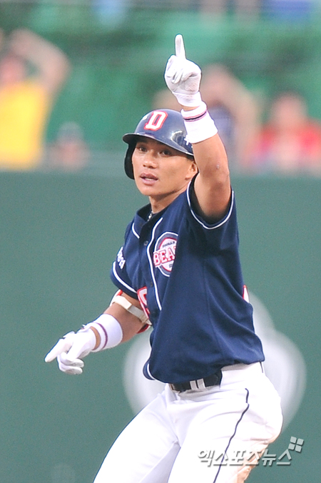 [엑스포츠뉴스=인천, 권혁재 기자] 2일 오후 인천 문학구장에서 열린 '2012 팔도 프로야구' SK 와이번스와 두산 베어스의 경기에서 SK가 3-2로 앞선 5회 1아웃 2루 두산 이종욱이 우익수 앞 1타점 적시타를 날리고 공이 홈으로 송구되는 사이 2루까지 진루하여 손을 높이 들어보이고 있다.