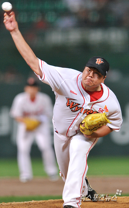 [엑스포츠뉴스=인천, 권혁재 기자] 2일 오후 인천 문학구장에서 열린 '2012 팔도 프로야구' SK 와이번스와 두산 베어스의 경기에서 4-4 동점인 가운데 9회 마운드에 오른 SK 채병용이 힘차게 공을 던지고 있다.