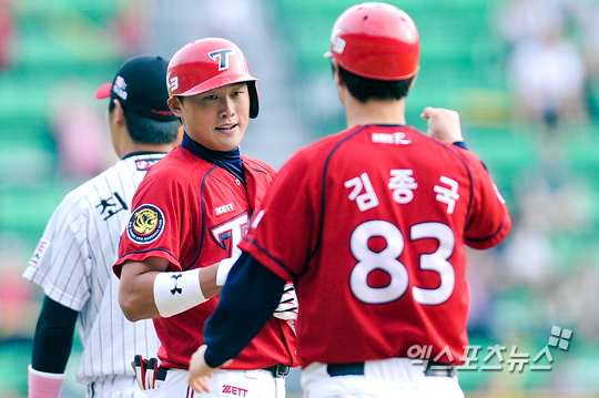 [엑스포츠뉴스=잠실, 권혁재 기자] 9일 오후 서울 잠실구장에서 열린 '2012 팔도 프로야구' LG 트윈스와 KIA 타이거즈의 경기에서 2회 KIA 이준호가 2타점 적시3루타를 날리고 김종국 코치와 하이파이브 하고 있다.