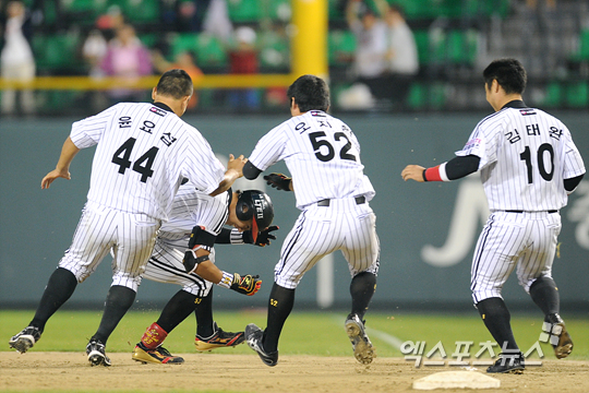 [엑스포츠뉴스=잠실, 권혁재 기자] 9일 오후 서울 잠실구장에서 열린 '2012 팔도 프로야구' LG 트윈스와 KIA 타이거즈의 경기에서 LG가 연장 10회 이대형의 끝내기 안타에 힘입어 4-3으로 승리했다.