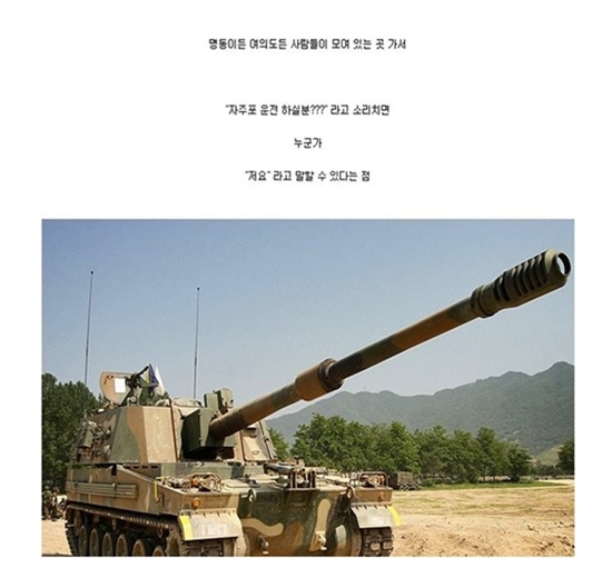 해당 게시물에는 "자주포 운전 가능하신 분?"이라고 외치면 누군가 한 명 정도는 "저요"라고 말할 수 있다는 설명과 함께 탱크 사진 한 장이 담겨 있다.