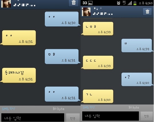 사진 속에는 음절이 아닌 한글 모음으로 남자 친구들끼리 주고받은 문자메시지 내용이 담겨 있다.