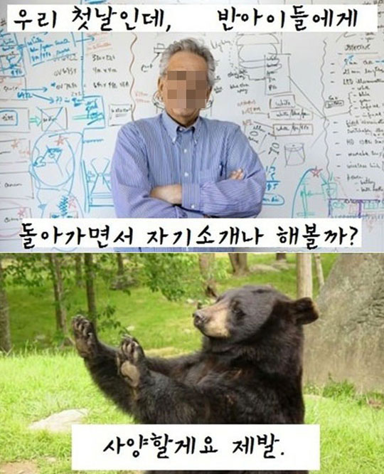이 게시물에서 교사로 보이는 남자는 "우리 첫날인데, 돌아가면서 자기소개나 해볼까?"라고 말한다. 이에 학생역을 맡은 곰은 손사래를 치며 "사양할게요 제발"이라고 말한다. 사진과 대사가 절묘하게 어울려 웃음을 자아낸다.