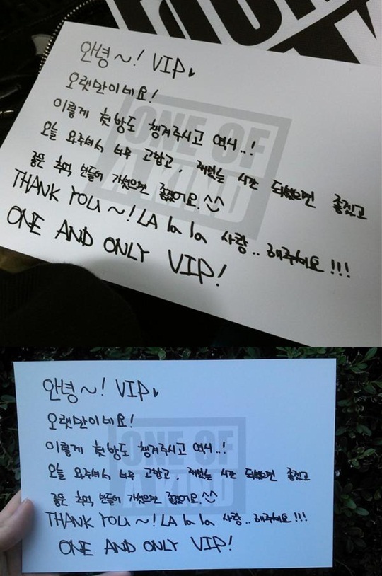 지드래곤은 "안녕 VIP, 오랜만이네요. 이렇게 첫 방도 챙겨주고 역시! 오늘 와주셔서 너무 고맙고 재밌는 시간 되셨으면 좋겠고 좋은 추억 만들어 가셨으면 좋겠어요. THANK YOU, LA la la 많이 사랑해주세요. ONE AND ONLY VIP"란 글을 손수 적어 팬들에게 깜짝 감동 선물을 했다. 삐뚤삐뚤한 그의 글씨체에 진심 어린 마음이 담겨있어 더욱 관심이 간다.