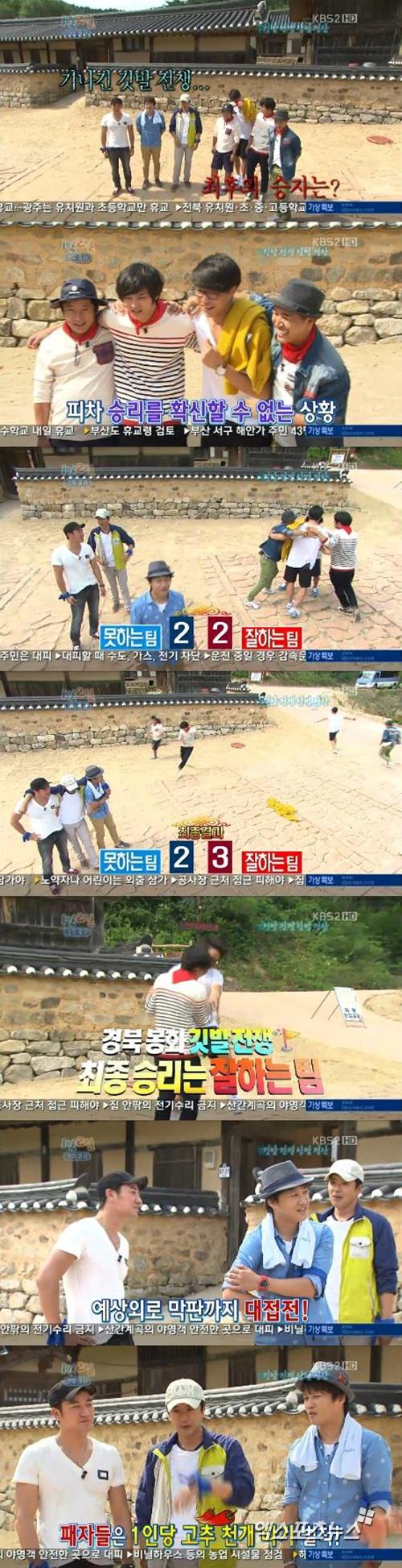 [엑스포츠뉴스=방송연예팀 원민순 기자] KBS 2TV '해피선데이 - 1박 2일'의 깃발전쟁이 이수근의 '잘하는팀' 승리로 끝났다.