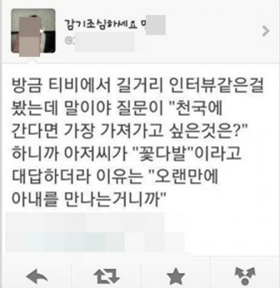 "방금 TV에서 인터뷰 같은 걸 봤는데, 질문에 '천국에 간다면 가장 가져가고 싶은 것은?' 하니까 아저씨가 '꽃다발'이라도 대답하더라. 이유는 '오랜만에 아내를 만나는 거니까'"라고 문구를 적었다.