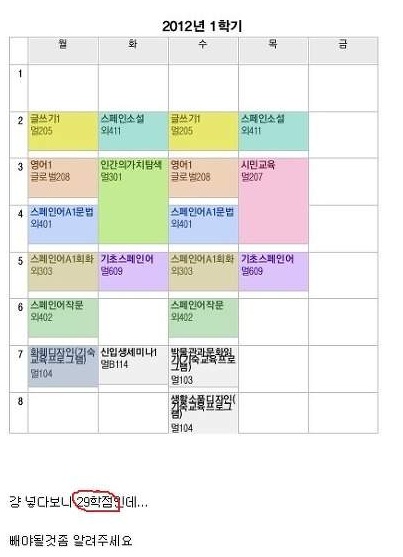 사진을 게재한 이 학생은 '넣다 보니 29학점인데 빼야할 것을 알려 달라'며 네티즌들에게 도움을 요청해 웃음을 선사했다.
