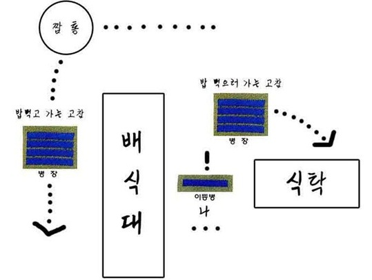 이어 "식당에서 해야 하는 인사는 두 가지였다. 식사를 끝내고 돌아가는 고참들에게 '맛있게 드셨습니까', 식사를 하고 있거나 시작하려는 고참들에게 '맛있게 드십시오'였다"며 "마침 배식을 받고 고참을 발견했는데 밥을 먹고 가는 고참과 밥을 먹으러 가는 고참이 있었다"고 설명했다.