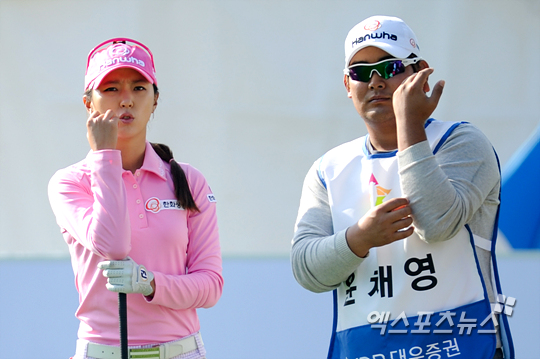 [엑스포츠뉴스=평창, 권혁재 기자] 21일 오전 강원도 평창 휘닉스파크CC(파72/6416야드)에서 열린 'KDB대우증권 클래식 2012'(총상금 6억원/우승상금 1억2천만원) 1라운드 윤채영(25. 한화)이 1번홀 티샷을 위해 캐디와 코스를 분석하고 있다.