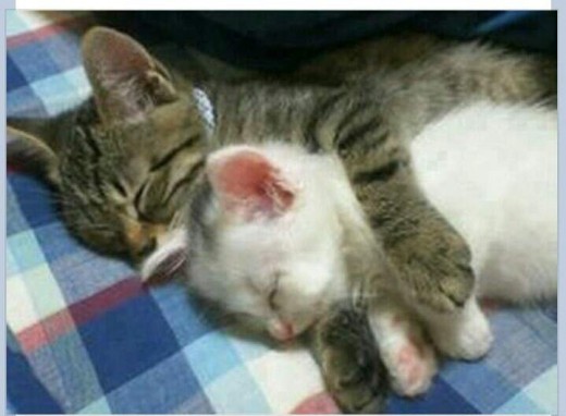 공개된 사진 속에는 갈색 얼룩무늬 고양이가 흰 고양이를 뒤에서 끌어안고 자는 모습이 담겨 있다.