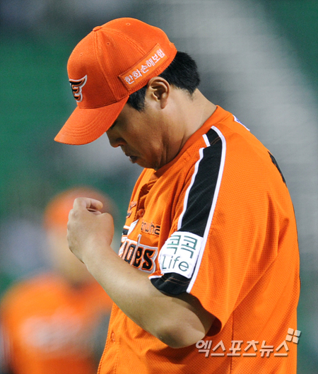 [엑스포츠뉴스=잠실, 권혁재 기자] 25일 오후 서울 잠실구장에서 열린 '2012 팔도 프로야구' 두산 베어스와 한화 이글스의 경기에서 한화가 3-1로 앞선 6회말 삼자범퇴로 막아낸 한화 선발투수 류현진이 덕아웃으로 들어가며 유니폼의 단추를 매만지고 있다.