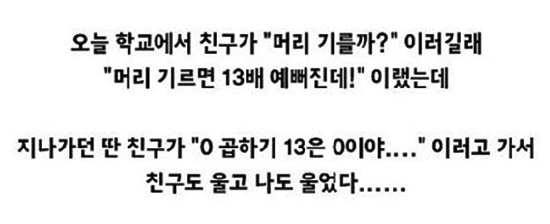 해당 게시물에는 "오늘 학교에서 친구가 '머리 기를까?'라고 하기에 '머리 기르면 13배 예뻐진다'고 대답했다"는 작성자와 그의 친구가 나눈 대화 내용이 담겨 있다.