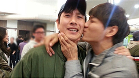 게재된 사진 속에는 '골든타임' 종방연 현장에서 지일주가 이선균에게 기습 볼 뽀뽀를 하고 있는 모습이 담겨 있다.