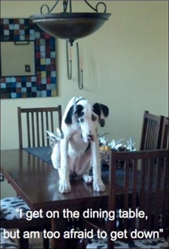 특히 이 강아지는 의기소침한 모습으로 식탁 위에 앉아있다. 이 강아지의 모습 아래에는 "식탁 위에 올라왔지만 내려가기 두렵다"란 자막이 쓰여있다.