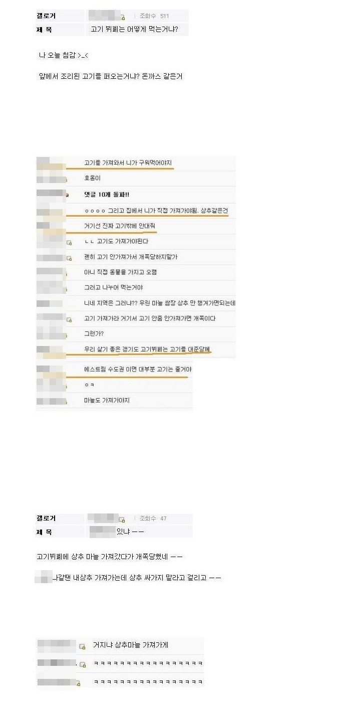 해당 게시물에는 고기 뷔페에 처음 간 작성자가 "앞에서 조리된 고기 퍼오는 거냐?"고 물었고, 이에 한 네티즌이 "상추는 직접 가져가야 한다"고 농담조의 댓글을 달았다.