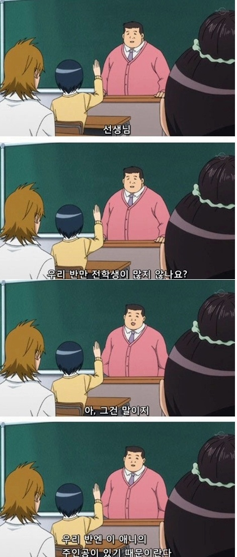 이에 선생님은 "아, 그건 말이지 우리 반에는 이 애니의 주인공이 있기 때문이란다"고 답해 보는 이들의 웃음을 자아낸다.