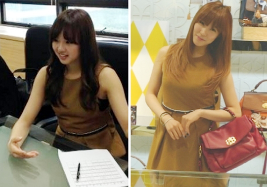 손연재는 트위터를 통해 가을 분위기가 물씬 나는 미니멀한 카멜 컬러 원피스로 여성미를 뽐냈다. 티파니 역시 손연재와 같은 원피스를 착용해 차분하고 단아한 매력을 연출했다. 그리고 붉은 계열의 백으로 포인트를 줬다.